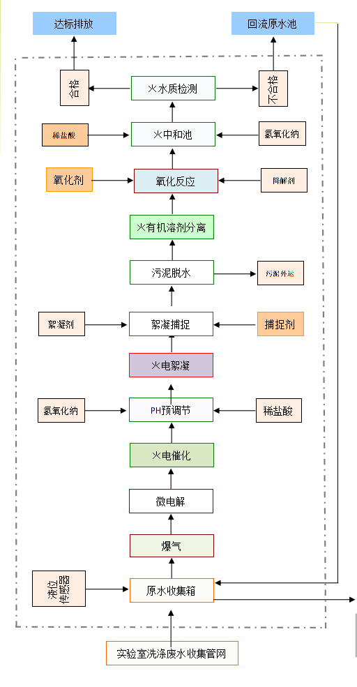 設備采用“原水收集箱→爆氣→微電解→電催化→PH預調節→電絮凝→絮凝捕捉→污泥脫水→有機溶劑分離→氧化反應→中和池→水質檢測→達標排放”工藝進行處理。